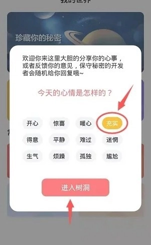 点击后会弹出一个小框,在里面选好对应的心情状态,接着点选下方的“进入树洞”按钮即可。
