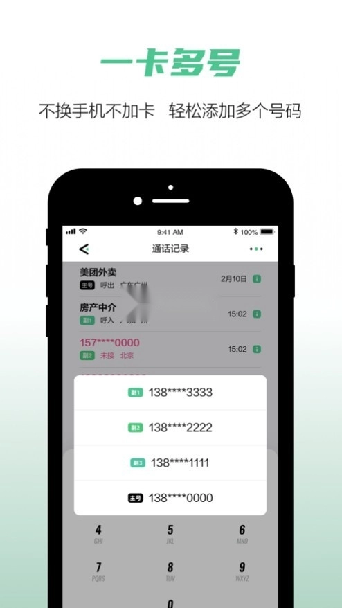 拥有多个手机号码时,不必配备多部手机或使用双卡双待设备,通过和多号应用,可将其中一个号码设为主要号码,其余号码设为附属号码,同一设备最多可同时管理四个号码。