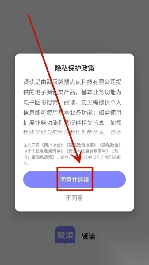 先把贤读小说这个应用安装好,之后打开它,接着找到并点击界面上显示着“同意并继续”的按钮。