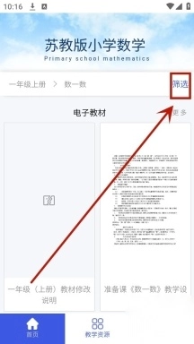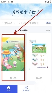 安装并打开苏教版小学数学应用,进入其首页后,点击“教学资源”选项。