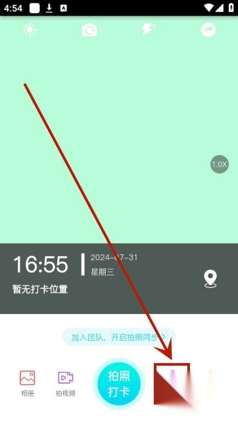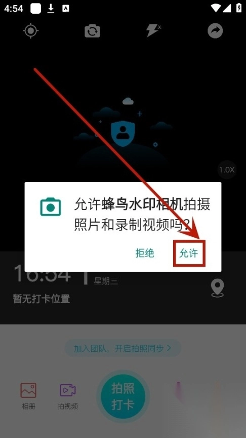 先把蜂鸟水印相机这个应用装好并启动,接着找到界面上的【拍照打卡】按钮,点击它就能完成拍照打卡的操作了。