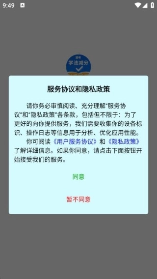 1、安装软件并进入后,若弹出服务协议与隐私政策,点击同意即可。