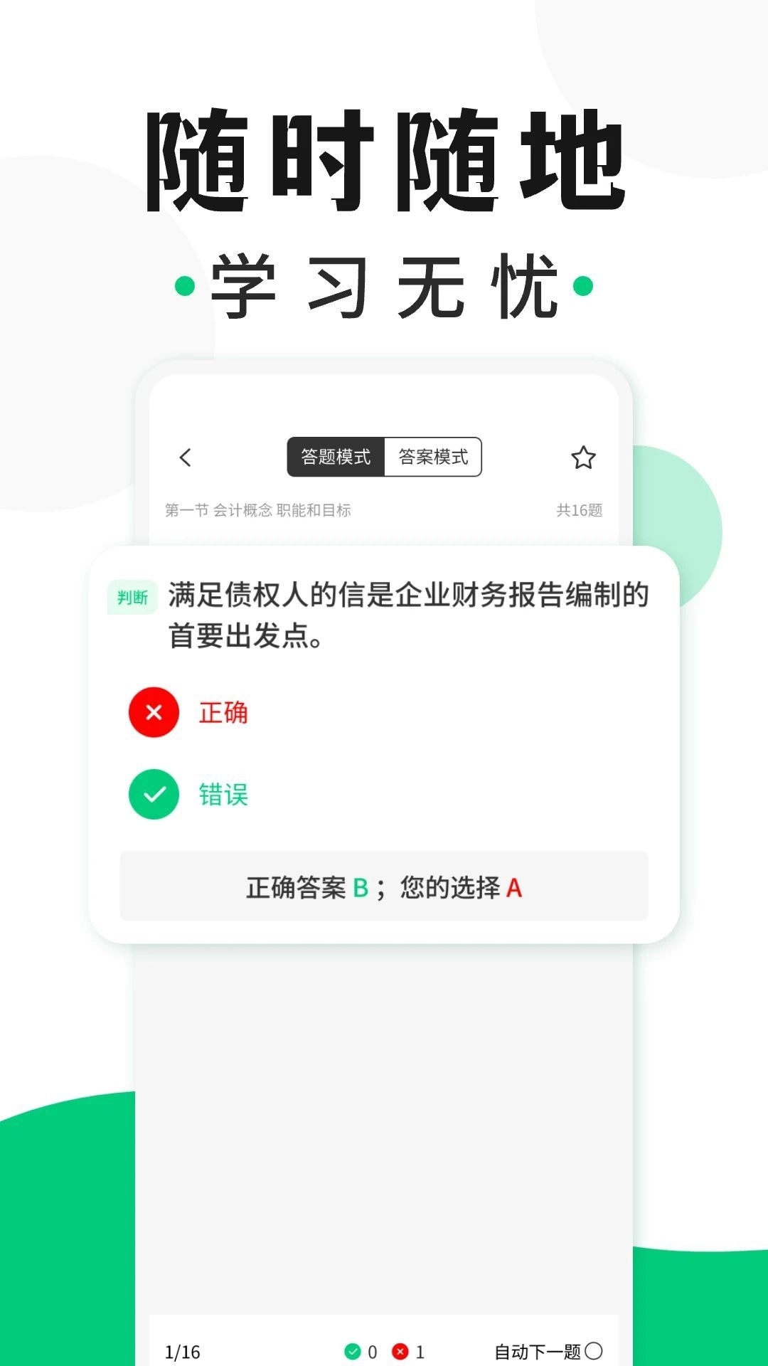 会计题库随身学真是一款超赞的手机刷题应用!它特别灵活,不管什么时候想复习都可以。这里涵盖了会计学的各类知识,不仅有海量的题库,还有基础考点解析。能帮助我们更深入地理解知识点,通过反复的答题练习,做题速度和正确率都能得到显著提高。而且平台上的真题全部免费开放选择,做完一道题会自动跳转下一题,无需等待,使用起来非常便捷!