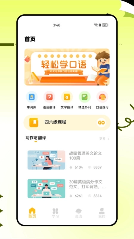 1、首页设有单词库、语音翻译、文字翻译、精选外刊及口语学习等版块,用户可在此获取写作与翻译相关资讯。