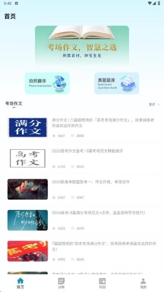 1、完成安装后,在首页即可查看,能浏览到拍照翻译、真题题库、考场作文等板块。