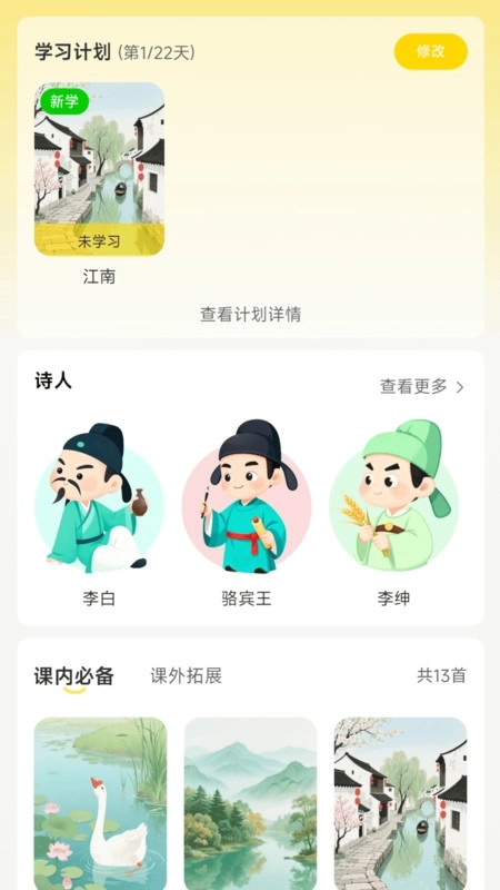 1、贴心学习计划:为古诗学习量身定制计划,让初学者从简单篇目入手,一步步进阶,帮助他们建立学习信心。