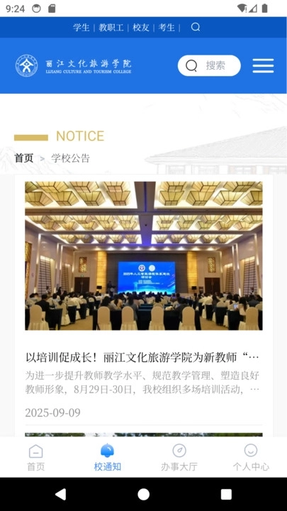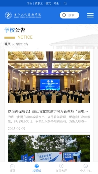 2、首页除了整合搜索、轮播展示、通知公告等核心功能模块外,还同步了学院的所有资讯内容,可第一时间展现学校的最新动态。