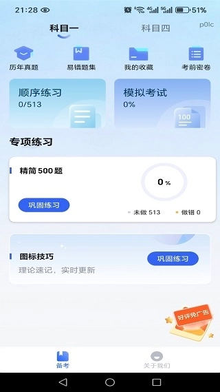 1、进入备考页面后,我们可以看到顺序练习、模拟考试等板块,同时也包含专项练习的内容。