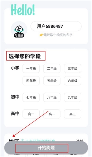 4、在首页选择对应学段和地区后点击开始刷题。