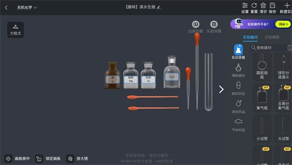 1、进入化学实验模块后,能够自主添加烧杯、试剂等各类实验器材。