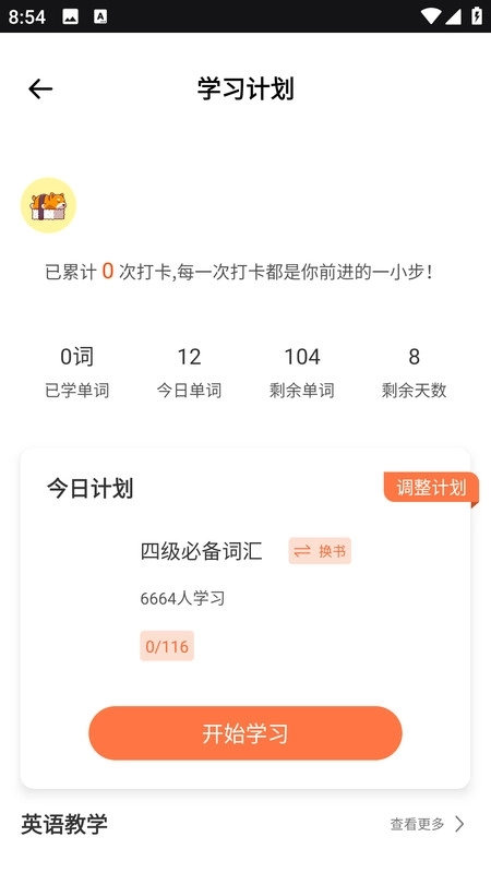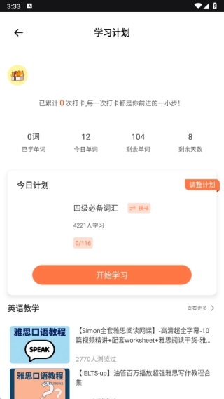 2、在学习计划页面,你可以了解今日的学习计划,同时还能开始学习各类英语知识。