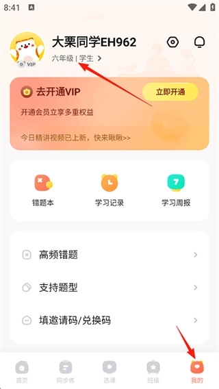 1、打开应用后点击个人中心的年级身份信息入口。