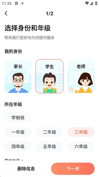 3、根据实际需求选择对应年级并确认下一步。