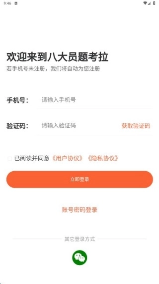 1、完成安装后进入登录界面,输入手机号与验证码就能登录成功,进而开展复习使用。