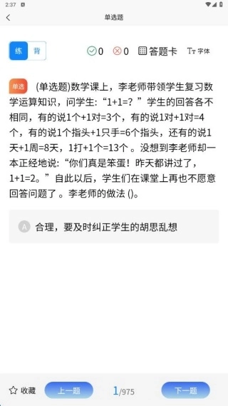 教师资格证考试学知题堪称学员们的备考利器!它涵盖的知识点极为全面,紧密贴合最新考点动态,还将各类重要题型进行了系统整合,便于大家在复习过程中随时查阅。其做题模式十分灵活,无论何时想刷题都能满足需求,每天的刷题数量会自动统计,同时实时呈现正确率,让学习进展清晰可见,帮助大家更轻松地备战教资考试。