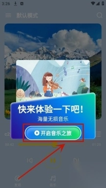 先把音乐宝盒下载安装好,打开它之后,找到界面上的【开启音乐之旅】按钮点一下就行。