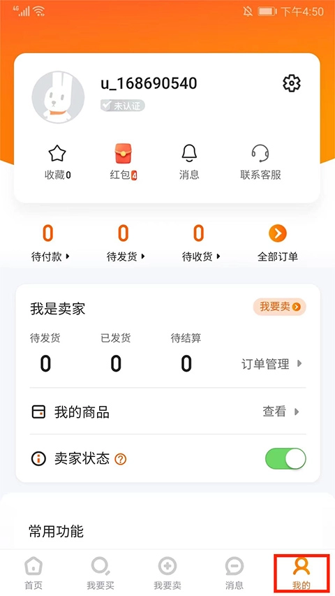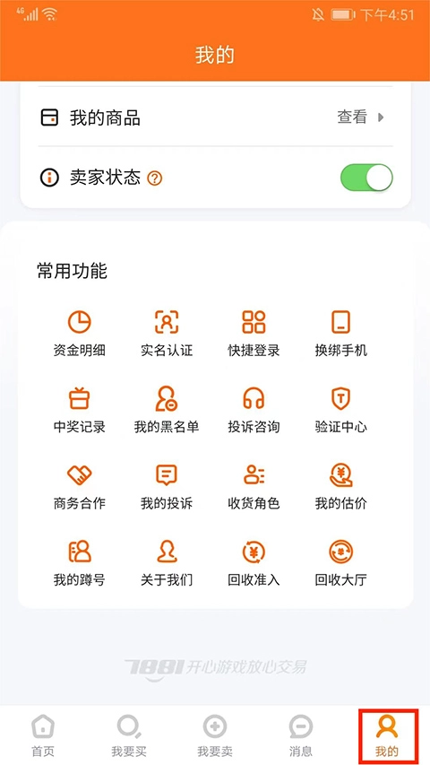 6、在【我的】界面,用户能够查看收藏、管理订单(包括订单详情),还能使用资金明细、实名认证、快捷登录、换绑手机等功能。以上便是7881游戏交易平台的使用方法。