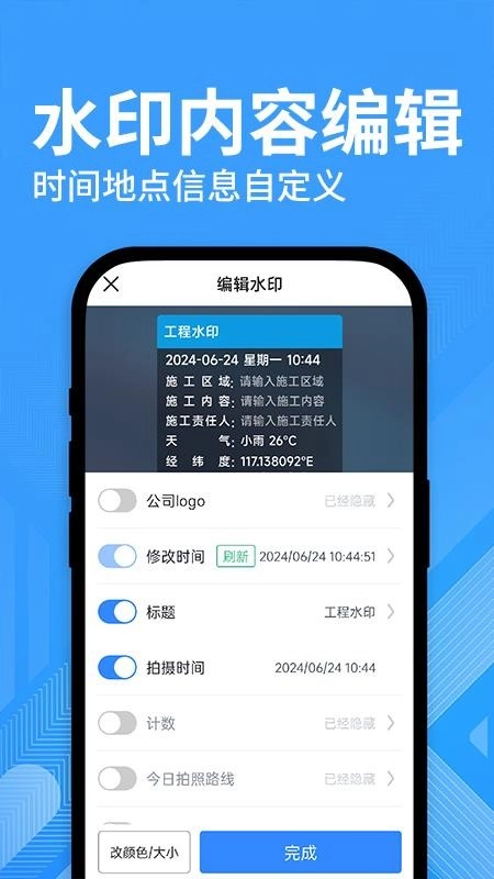水印修改打卡相机是帮助用户轻松拍摄水印照片的相机软件,你可以通过软件轻松的进行各种水印拍照,让你可以拍摄自己需要的水印照片,例如:工程记录、上下班打卡、执勤巡逻、工作进度记录等等,满足不同行业工作人员的拍照记录需求,通过拍照的方式记录各种水印。水印修改打卡相机最新版还为你提供了丰富水印模板,你可以获取不同的水印模板效果,根据自己的工作需求,就可以选择水印模板进行使用了,这样就可以更快速的拍摄符合要求的水印照片,需要的用户快来吧,以后你的各种拍照记录就会更加的轻松了!