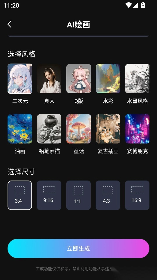 用户输入描述词、风格、尺寸后,点击“立即生成”按钮即可完成操作。