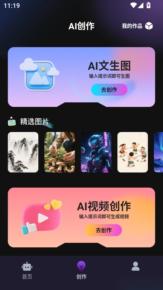 之后点击底部菜单栏的“创作”按键,接着找到“AI文生图”板块下方的“去创作”按钮并点击进入。