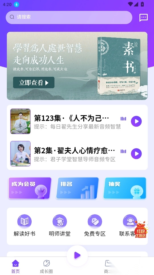 君子学堂最新版是一款提供全方位育人课程资源的学习类软件,软件中将各种素质教育课程资源全面覆盖,帮助用户得到全方面的提升,用户可以开通会员解锁会员专属特权,用户可通过购买课程的方式获取你想要的各种课程资源学习,打造各种书籍的专属商城,用户可以随时到商城中查找你需要的各种书籍资源下单购买,让用户购书学习更方便,还推出有抽奖活动,用户可以随时参与各种抽奖活动获取随机奖品,其中不仅有各种视频课程,还有很多的音频课程,可以让用户释放双手学习课程知识,有需要的用户就快来君子学堂使用吧!