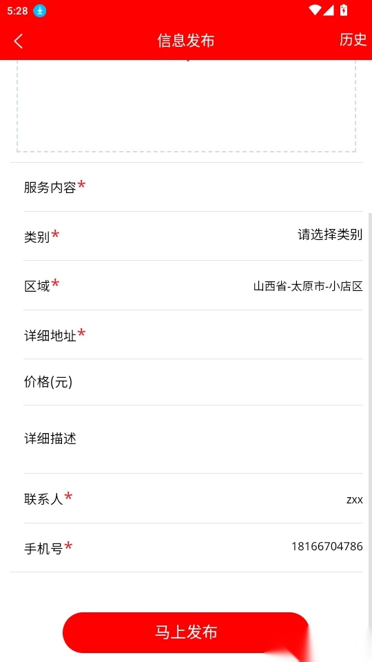 最后就可以将你要发布的服务信息进行详细编辑后点击“马上发布”即可