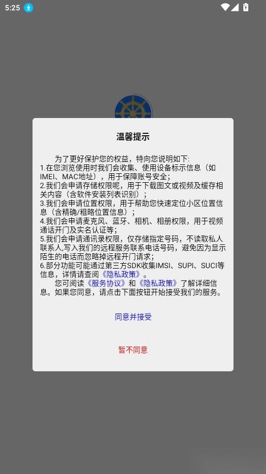 打开软件阅读“温馨提示”点击“同意并接受”进入下一步