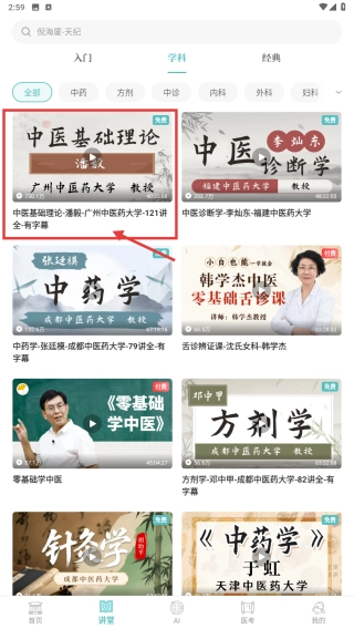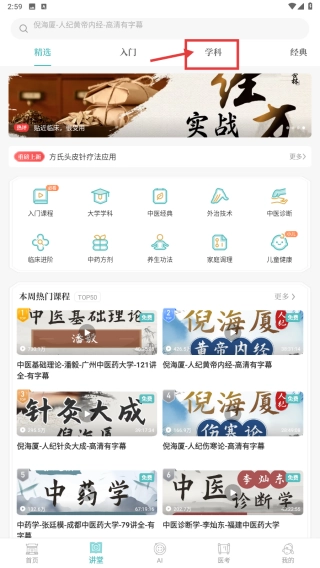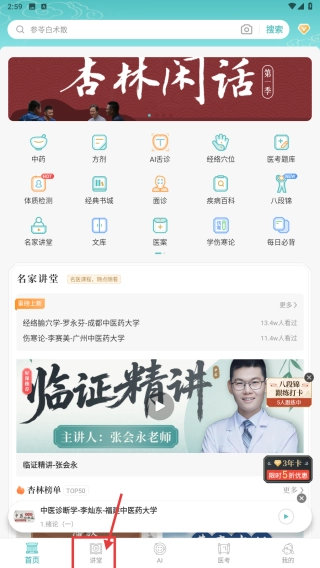 打开中医学习应用后,点击底部的“讲堂”选项,即可进入课程学习页面。