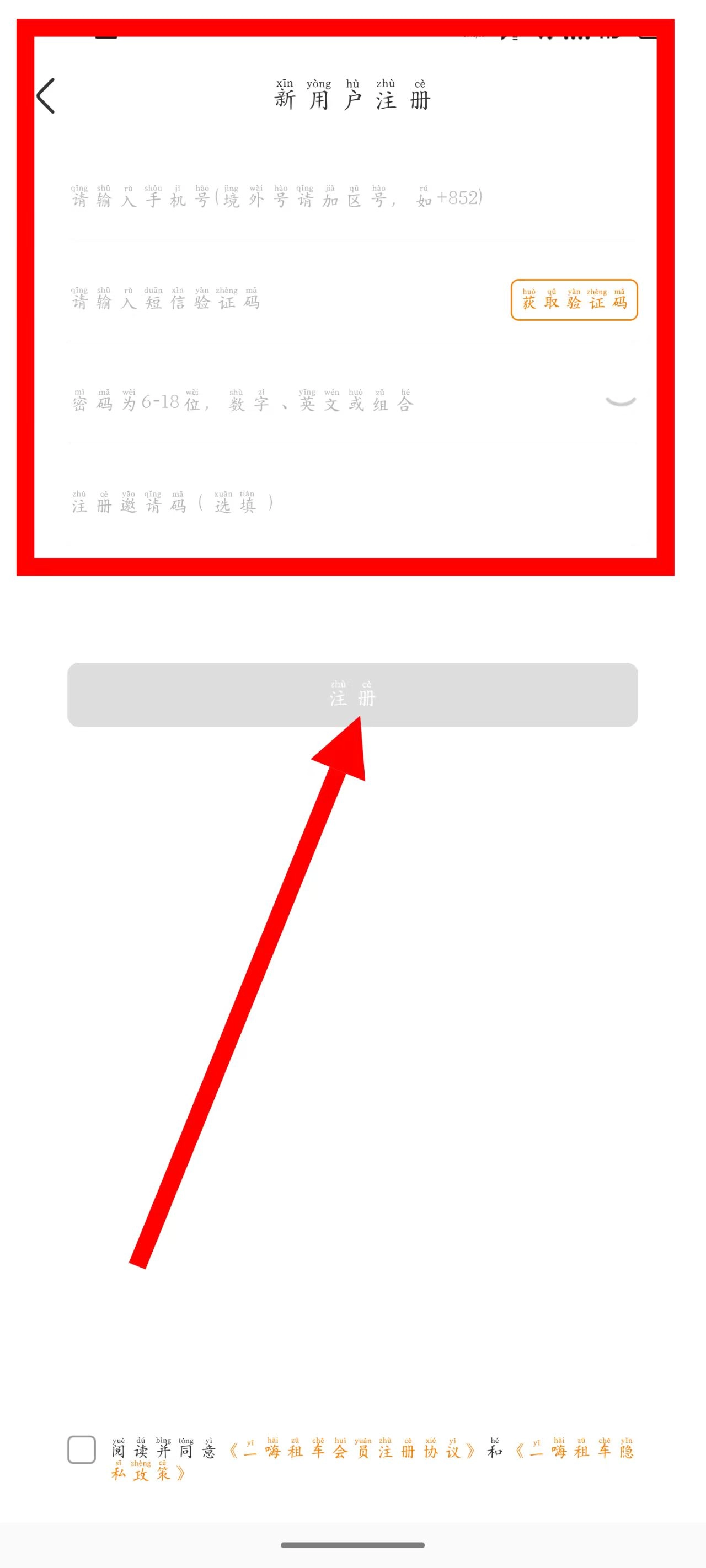 输入手机号码和验证码,勾选同意相关协议后,点击注册按钮,即可完成注册操作。