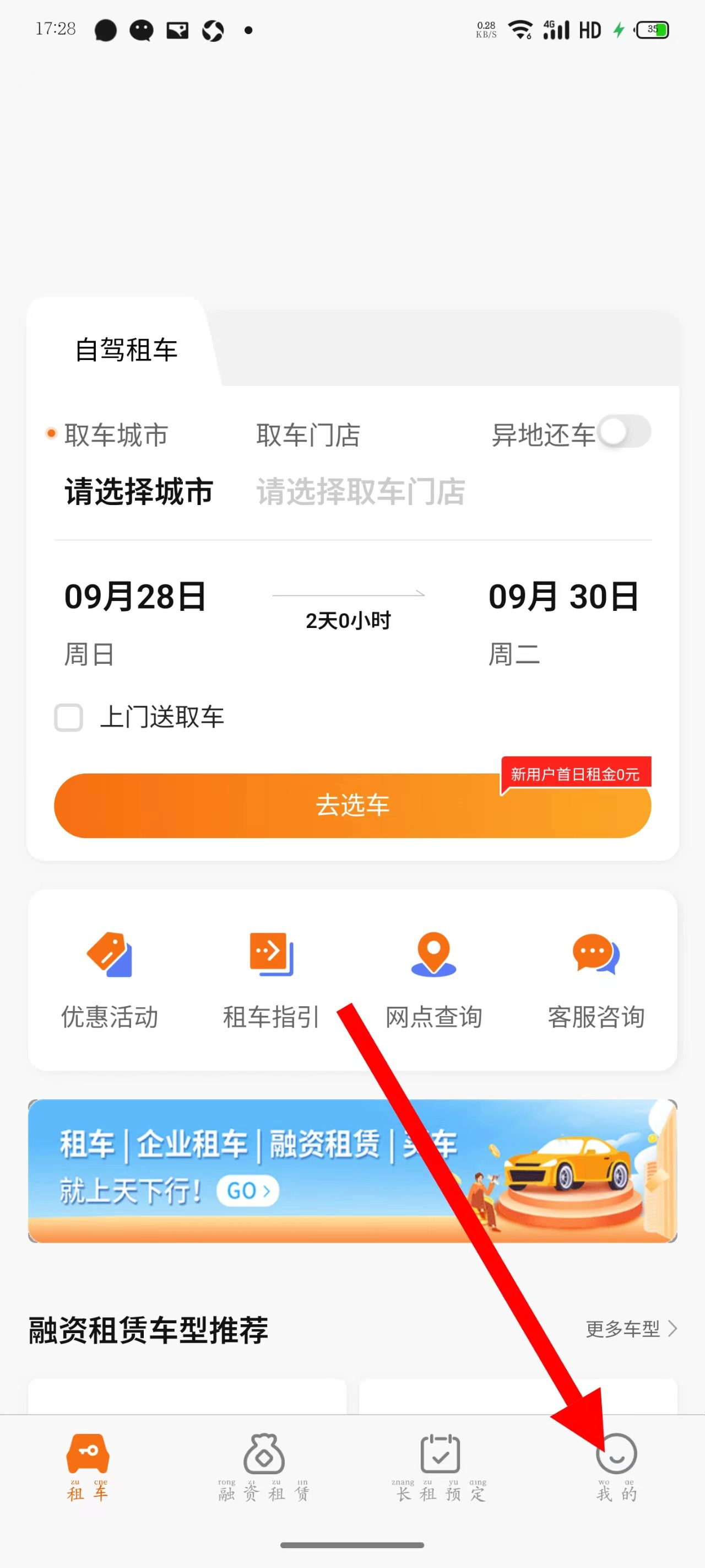 打开天下行租车,点击底部我的。