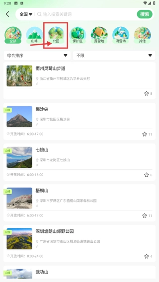 在景点分类页面,点击公园标签,浏览公园类景点列表。