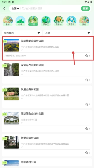 在公园景点列表里,找到深圳塘朗山郊野公园这一项,点击进入它的详情页面。