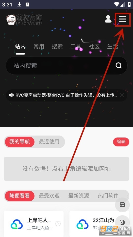 先把荔枝资源库这个应用装好并启动,然后找到界面右上角那个由三条横线组成的图标,点击它就可以了。