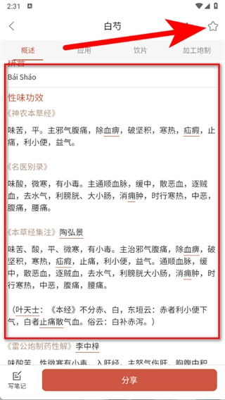 4、查阅其性味、功效等经典中医知识,深入学习中医药材的相关内容。