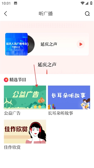 在听广播的页面上,点击“公益广告”选项,即可进入公益广告的播放页面。