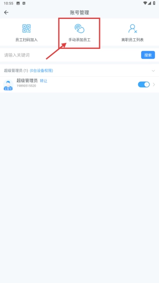 在账号管理界面,选择手动添加员工的选项,即可开展员工账号的添加工作。