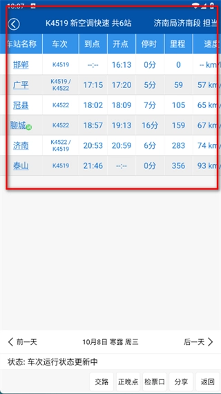 4、查看该列车车次的途经站点、到达时间、出发时间等详细的时刻表信息。