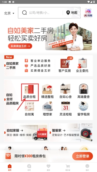 1、打开租房类应用,点击品质合租的入口,进入合租房源的筛选页面。