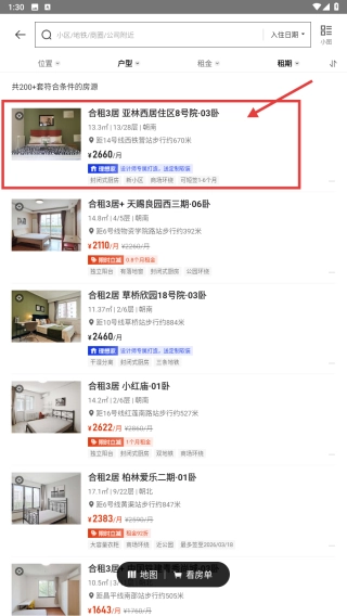 3、点击“查看房源”按钮,系统将加载出满足筛选条件的合租房源列表。