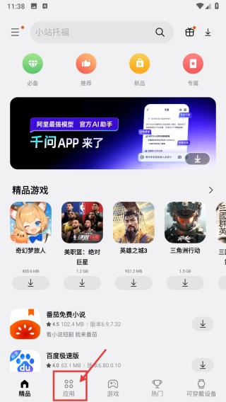 打开应用商店类应用,点击底部的应用选项,进入应用页面。