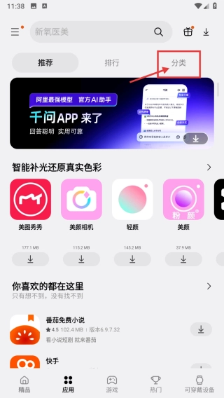 在应用页面,点击分类选项,进入应用分类页面。