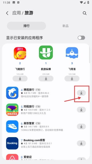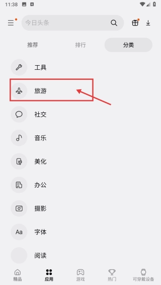 在应用分类页面,点击旅游分类选项,进入旅游应用列表页。