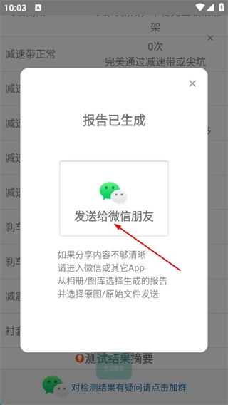 当报告生成完成的弹窗出现后,点击“发送给微信朋友”的选项,即可把这份报告分享给微信好友。