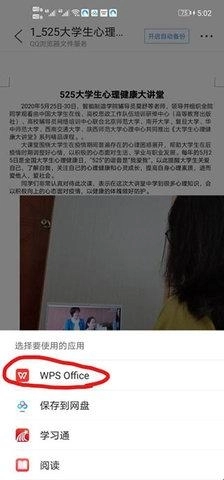 6、选择其他应用打开后,会弹出应用选择界面,此时选择WPS Office即可(进行该操作需要使用手机版WPS,若手机中未安装,可在手机应用商店搜索下载)。