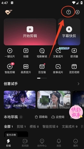 1、进入软件剪辑首页之后,点击右上角这个问号图标。