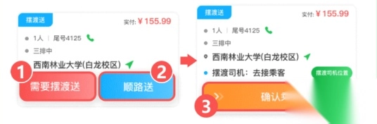 情况二:若由摆渡司机负责送载,先点击②「需要摆渡送」,此时可查看摆渡司机的位置和距离信息;之后通过滑动操作执行③「确认乘客下车」,“乘客已下车” 按钮随即置灰(不可操作)
