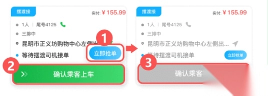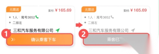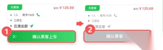 情况二:要是由摆渡司机来负责接载,操作步骤是先通过滑动操作执行②「确认乘客上车」;之后③“乘客已上车”按钮会变成灰色(无法进行操作)。