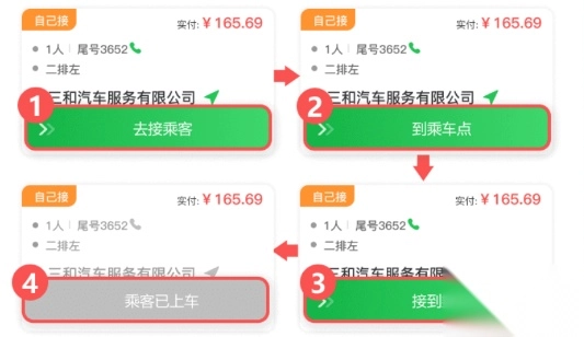 操作流程:通过滑动操作依次执行以下步骤:首先进行“去接乘客”的操作;接着完成“到达乘车点”的确认;然后进行“接到乘客”的操作;最后“乘客已上车”按钮变为不可操作的置灰状态。
