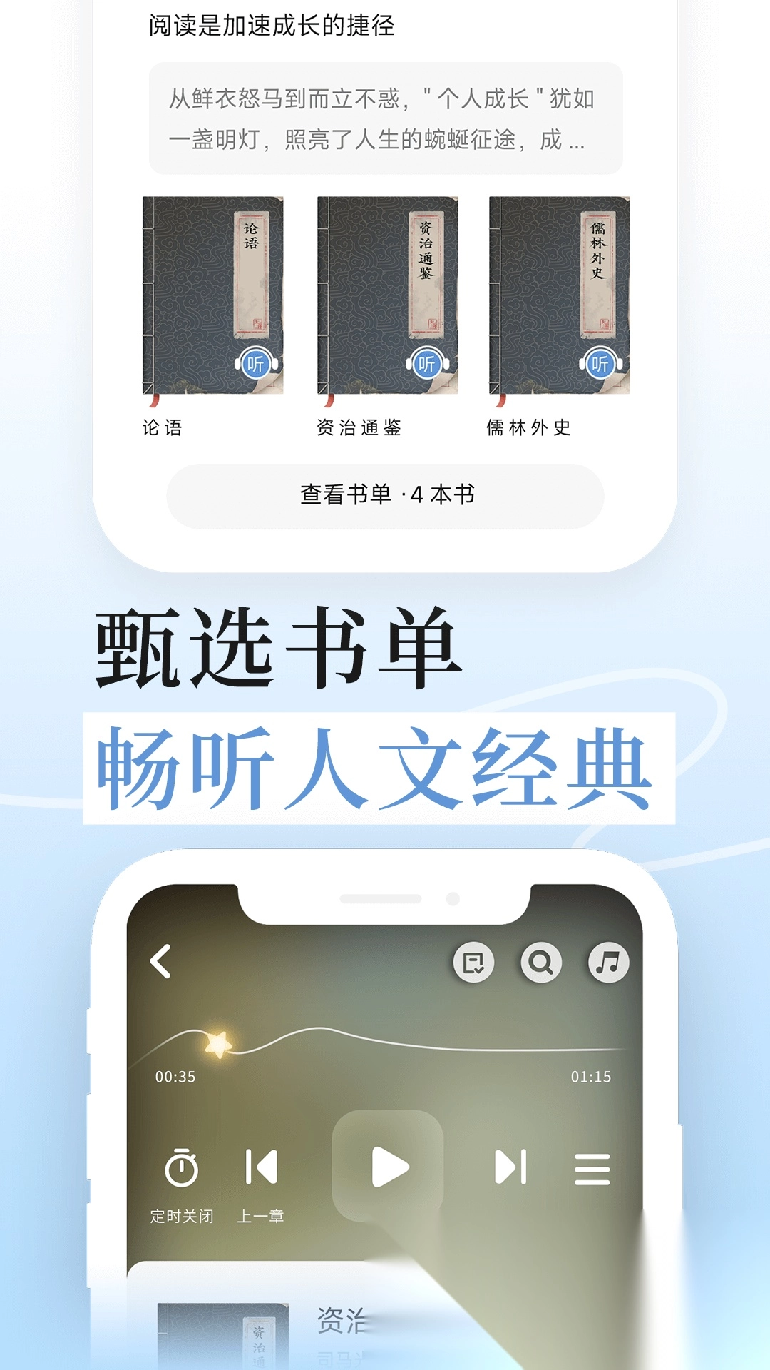 这里汇聚了海量经典古籍,从四大名著、四书五经,到史书典籍、医学元典,再到处世哲学、逸闻奇志以及启蒙经典,应有尽有。我们推出了音频阅读服务,由经验丰富的配音团队打造高品质的听觉内容,使您无需手持书籍或紧盯屏幕,就能轻松徜徉于经典古籍的世界。