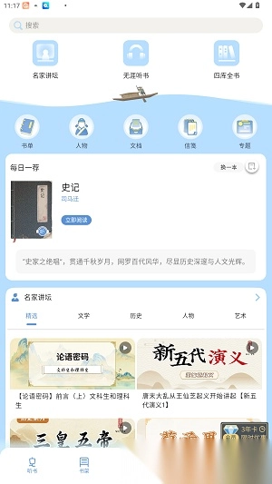 5. 无需付费,即可在线观看各类名家讲解历史,内容包含文学、历史、人物、艺术等栏目。经典古籍的阅读权限完全开放,无需任何费用即可浏览;但如果想通过听书形式享受内容,则需要开通付费会员服务。